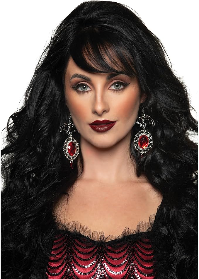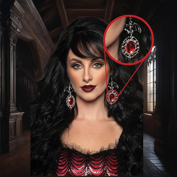 This pair of hook style dangle earrings with a red colored faux jewel and vintage Victorian design with a bat on each earring is perfect for Halloween, theatrical productions, witches, horror con, gothic & vampire looks, Elvira looks, cosplay, everyday fun and more! Other Halloween costumes and accessories are sold separately on our page – subject to availability. ** Pierced ears are required to wear these earrings.