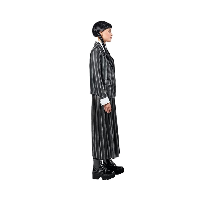 Wednesday is allergic to color. This officially licensed black and gray Wednesday Nevermore Student Academy Uniform from the live action series, Wednesday, directed by Tim Burton includes a black top with attached collar and partial tie, jacket with Nevermore Academy logo and matching skirt. Once you have it on, you'll look just like Wednesday - all mysterious and spooky! This costume dress is available in 3 women's sizes Small 4-6, Medium 8-10 or Large 12-14. Costume sizes tend to fit a little smaller than clothing sizes - please purchase accordingly. Other Wednesday costumes and accessories (wigs, leg wear, Thing shoulder sitter prop, theatrical makeup...) are sold separately on our page - subject to availability. Footwear and stockings not included.