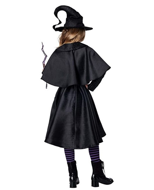 A gathering of wickedly worthy witches. This children's Witch Coven Coat dress includes a capelet with glitter collar, a button up coat dress with glitter trim sleeve ends, a belt with decorative buckle and a stylized witch hat with stuffing. The belt is fastened in the back with a hook and loop closure. This costume does noes not include the striped tights, wand or boots. Other witch costumes and accessories (brooms, wigs, wands, leg wear, hair extensions and braids, jewelry, face jewels, noses, theatrical makeup...) are sold separately on our page – subject to availability. Comes in girls' sizes - Medium 8-10 or Large 10-12. Costumes typically run a little smaller than regular clothing sizes. Please purchase accordingly.