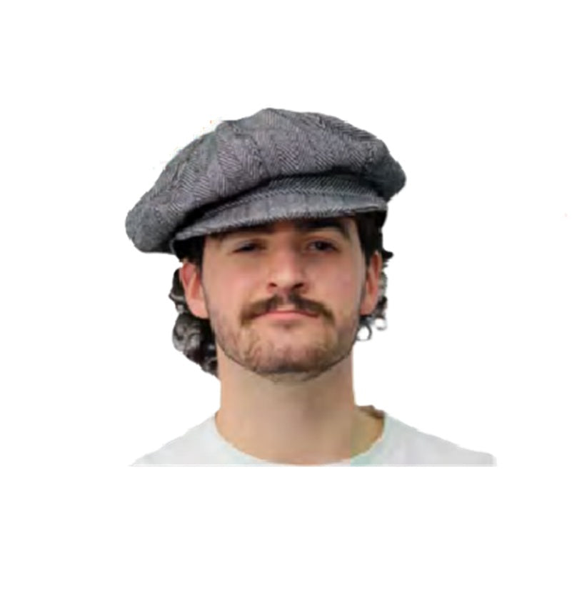 Make a statement and step back in time with this early 20th Century Newsboy Bootlegger Cap, a chic addition to any wardrobe or costume. Inspired by the stylish headwear of the 1910s to 1920s, this cap perfectly balances vintage charm with contemporary comfort. The black and gray outer shell of this classic cap is expertly crafted from a blend of polyester and cotton, providing a pleasing balance between softness and durability. The herringbone tweed shell adds a texture and sophistication that harkens back to the early 20th century. This Bootlegger Cap features an elastic band inside the lower edge, promising a snug fit for a variety of head sizes - one size fits most adults and larger teens. This detail guarantees the cap stays securely in place, whether you're driving an open-top vintage car or dancing the night away at a themed party. The stiffened, pre-curved bill not only adds to the cap's classic aesthetic but also provides practical sun protection. Its timeless style makes it an excellent accessory for historical reenactments, theatrical performances, Peaky Blinders looks, 1800's newsboys, Brad Pitt, Shawshank Redemption looks, disco styles, Cameron Frye from Ferris Bueller or simply as a unique addition to your everyday ensemble. Experience a taste of yesteryear with this meticulously designed Bootlegger Cap. Other hats and early 20th Century costumes and accessories (spats, suspenders, facial hair, wigs, theatrical makeup...) are sold separately on our page – subject to availability.