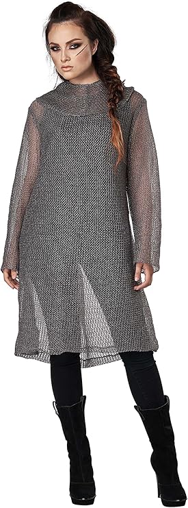 Bravely charge into battle or the party in this medieval Knight chainmail tunic costume. A Knight is chivalrous off and on the battlefield. This unisex Knight Chainmail Tunic, in metallic look silver gray, is a lightweight, knit fabric tunic with an attached hood. It is available in Men's sizes (may be a little big on women) Small Medium or Large XL. Costumes typically run a little smaller than regular clothing sizes. Please purchase accordingly. Perfect for Halloween trick-or-treating, themed parties, Renaissance Faires, cosplay and more. Hand wash and lay flat to dry. Does not include boots, surcoat (over tunic), sword or pants. Other costumes and accessories (knight surcoat, boot covers, boots, crowns, chainmail costumes and hoods, weapon props...) are sold separately on our page – subject to availability.