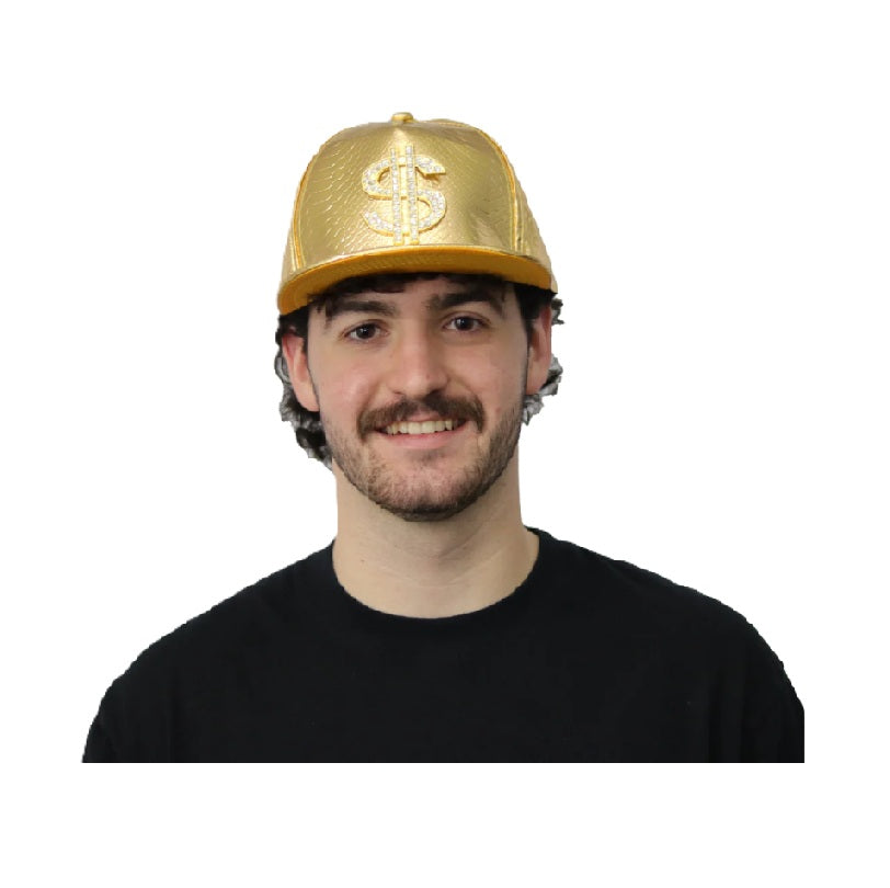 Shine bright with this unisex, playful gold dollar sign baseball cap. Crafted from imitation leather (polyester), this cap adds a flashy, fun touch to any outfit from pimps and rappers to disco looks. One size fits most, making it easy to wear and perfect for standing out in the crowd. This gold metallic style hat with dollar sign on the front made popular by rappers of the late 80's and 90's is perfect for any Rapper, Pimp, OG MC, 80's and 90's looks, TV and Movie Stars and more. One size fits most adults and larger teens. Combine with your own clothing and shoes - not included. Other costumes and accessories (fake teeth, rings, wigs, jewelry, other hats, face jewels, hair extensions, chains...) are sold separately on our page – subject to availability.