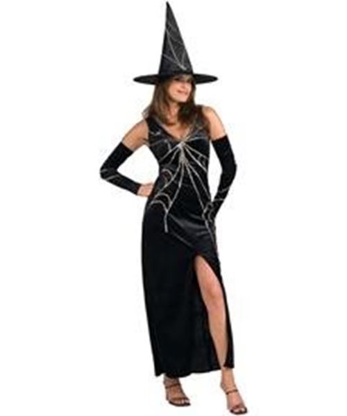 “When witches go riding, and black cats are seen. The moon laughs and whispers, ‘tis near Halloween.” Who will be caught in your web tonight?? This shapely Witch Costume includes a long black dress with a sexy slit, matching hat and glovelettes. The finishing touches to this enchanting Witch costume includes a tall pointed hat with shimmering sequins in a web design and the dress is decorated in the same shimmering sequins designed as a web. Fits a women's size standard up to dress size 12 (Bust 36-38 Waist 27 - 30). Costumes typically run a little smaller than regular clothing sizes. Please purchase accordingly. Other witch costumes and accessories are sold separately on our page – subject to availability.
